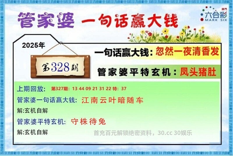 | 328期:一句话赢大钱【忽然一夜清香发】 解料:忽然一夜清香发解夜肖鼠牛虎鸡狗猪 综合:牛狗兔蛇猪鼠 |